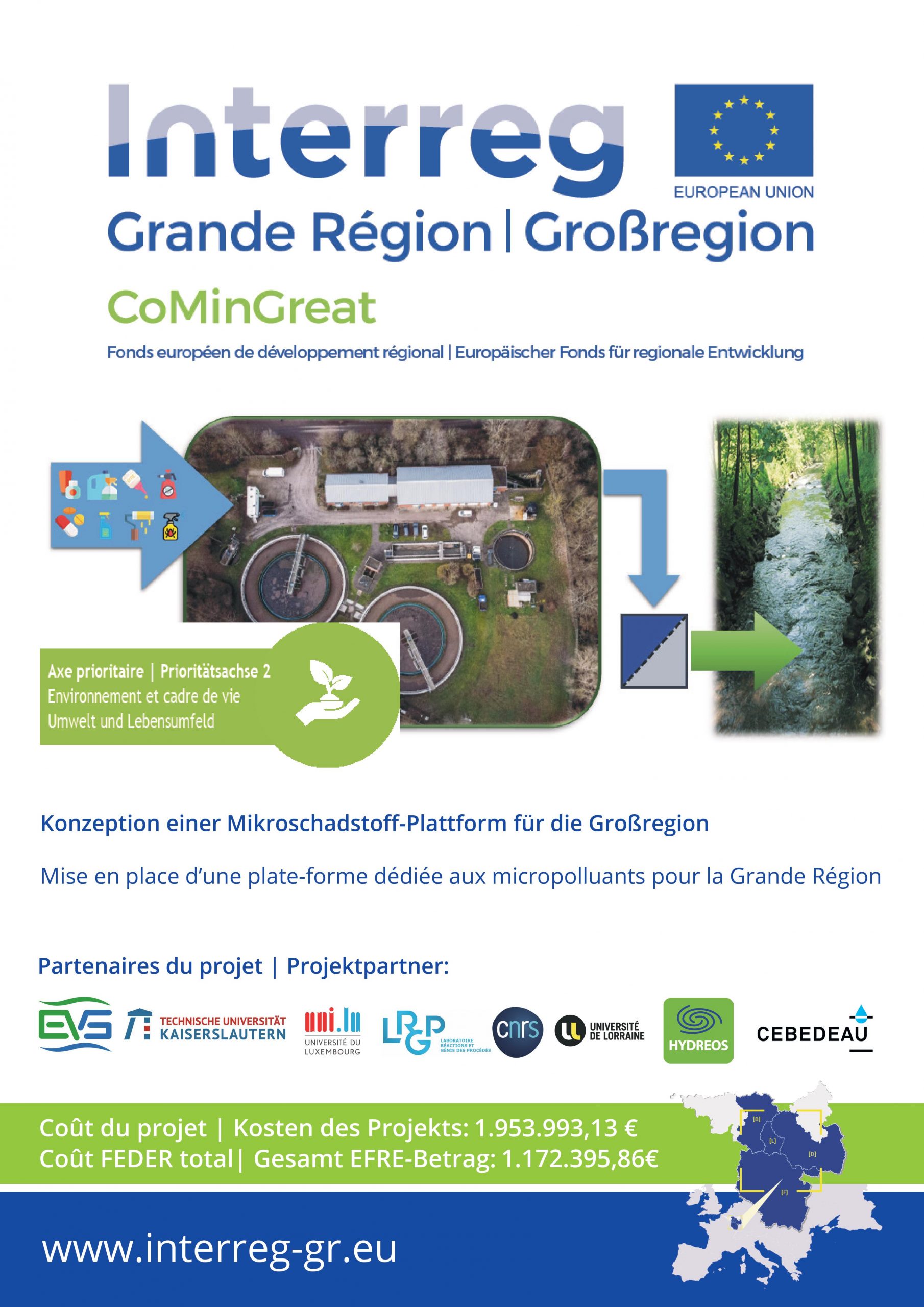 Das Projekt CoMinGreat dient der Sammlung und Harmonisierung von Wissen zum Themenfeld Mikroschadstoffe in der Großregion, dem Ausbau vorhandener Kompetenzen, dem Wissenstransfer, sowie der Förderung der grenzüberschreitenden Zusammenarbeit. Hierzu soll eine Internetplattform, kombiniert mit einer interaktiven Karte erstellt werden. Hinzu kommt ein Informations- und Demonstrationszentrum als zentrale Anlaufstelle für die Akteure und Entscheidungsträger in der GR sowie die interessierte Öffentlichkeit.